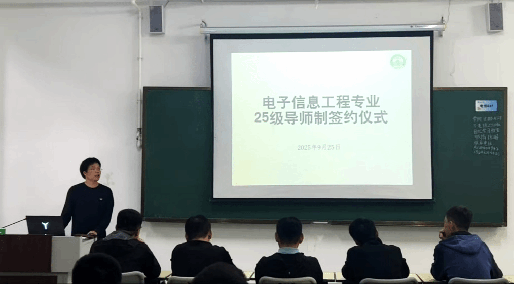 签约仪式由电信251班班主任高洪学老师主持。高老师介绍了导师制的运行模式。导师制将通过“一对多”的指导模式,为学生量身定制学业规划,覆盖专业课程学习、科研项目参与、学科竞赛备赛等环节,来提升学生的综合能力,实现从“课堂学习”到“实践创新”的精准衔接。