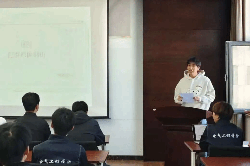 吕春辉同学上台分享了他的减脂历程。他从125公斤成功减至80公斤,以亲身经历讲述了科学饮食、规律运动与良好心态在减肥过程中的重要性。他鼓励同学们珍惜训练机会,坚持自律,勇于突破自我,收获健康与自信。