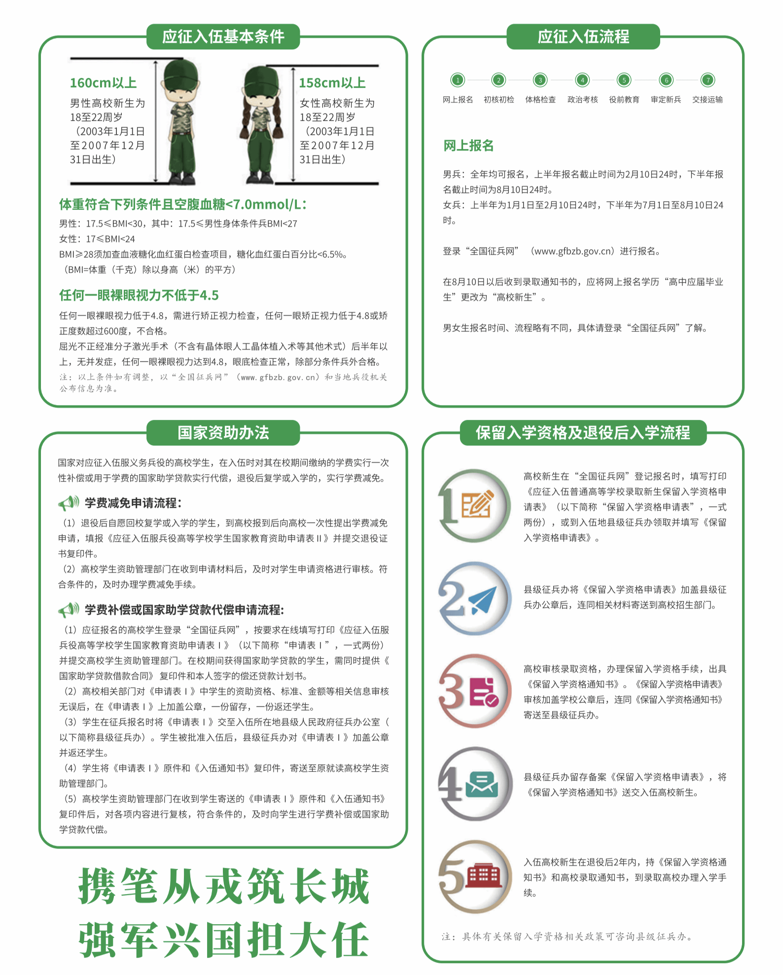 ,是砥砺品格、增强意志的好课堂,是施展才华、成就事业的大舞台。“生命里有了当兵的历史,一辈子都不会后悔”。国防和军队现代化建设,迫切需要一大批有责任、敢担当的有志青年携笔从戎、报效祖国。为鼓励大学生应征入伍,国家出台了一系列优惠政策,现寄上,供参考。