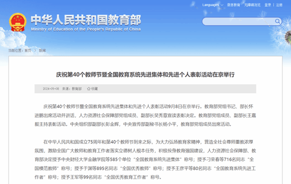 9月8日,庆祝第40个教师节暨全国教育系统先进集体和先进个人表彰活动在北京举行。此次受表彰的全国模范教师共有716人,MG电子