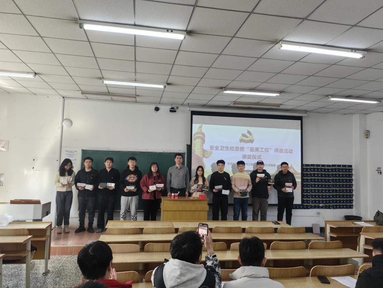 为提高研究生防火安全意识,维护研究生课题组良好的卫生环境,打造浓厚的学术研究氛围,电研第三党支部在上学期期末和本学期期初开展安全卫生检查暨“最美工位”评选活动。3月8日,电研第三党支部在二教西202召开安全卫生检查暨“最美工位”评选活动颁奖仪式,支部书记单鑫为获得“最美工位”称号的党员颁发“党员标杆工位”标识牌和东电文创杯奖品作为鼓励。