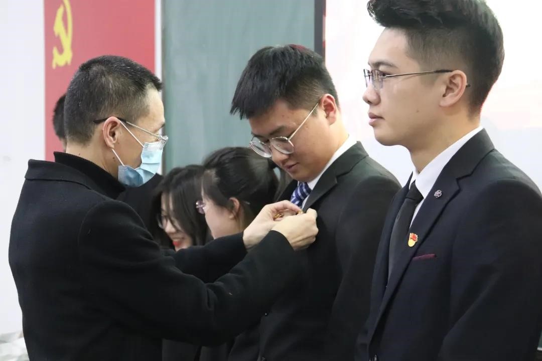 拟发展对象逐一宣读入党志愿书,他们分别从对党的认识、入党动机、现实表现和其他问题等方面向大会汇报个人情况,表明了自己真诚坚定的入党决心。其入党介绍人依次对拟发展对象在培养期的思想、工作、学习等各方面表现向支部大会进行陈述和评价。经过支部充分讨论,无记名投票表决,同意五名拟发展对象加入党组织。岳军为大家佩戴党徽,入党介绍人为大家颁发入党纪念卡。