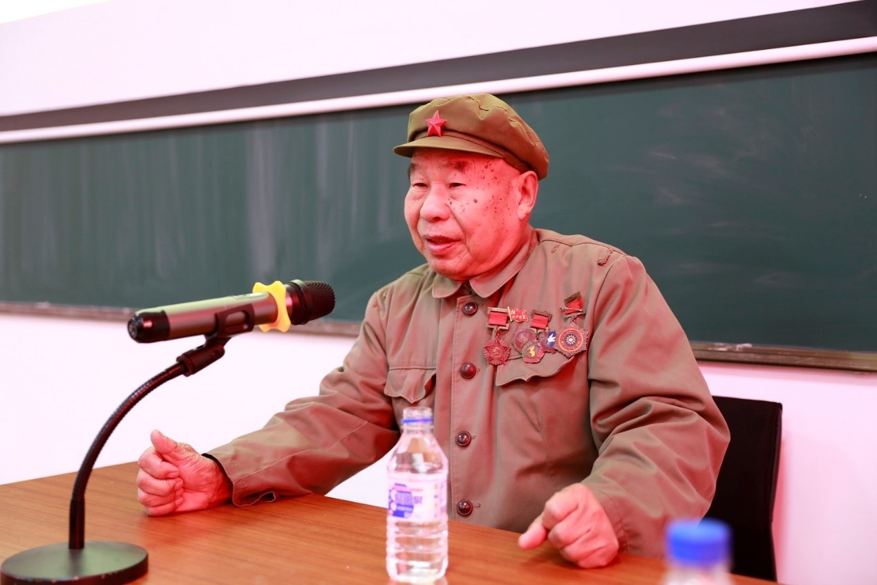 年近九十高龄的代宝善老人,参加过抗日战争、抗美援朝等很多战役,在讲起那段艰苦岁月时,老人仿佛又回到了过去和敌人战斗的场面,生动感人的事迹,体现出老一辈革命家坚定的理想信仰,展现了中国共产党人坚强的革命意志、顽强的革命精神。大家在代老的带领下,唱起了《没有共产党就没有新中国》。代老呼吁同学们要不忘历史,努力学习,为祖国未来的发展做出更大贡献。
