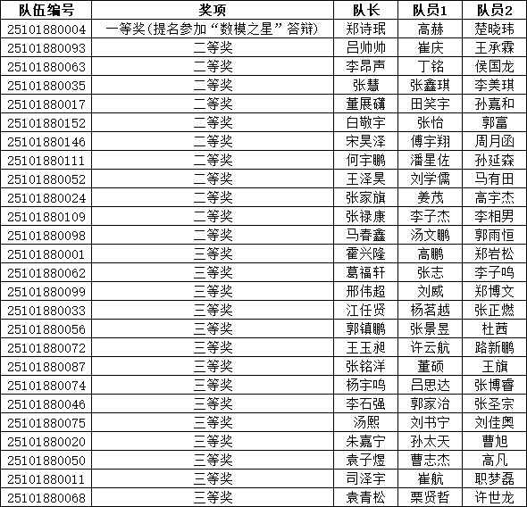 在该赛事中的历史最佳成绩:共获全国一等奖(获奖比例为1.00%)1项、二等奖(获奖比例为12.66%)11项、三等奖(获奖比例为19.82%)14项。2025年获奖人数达74人,较2024年增长105.6%,实现跨越式提升。值得关注的是,获得全国一等奖的小组凭借优异表现,已被提名参加“数模之星”全国总决赛答辩,将向更高荣誉发起冲击。