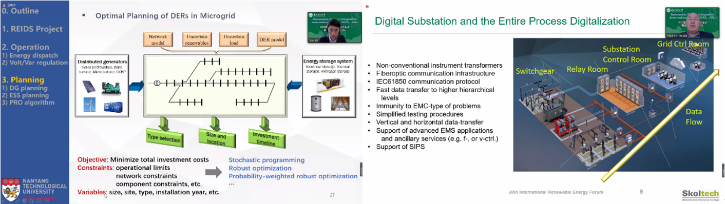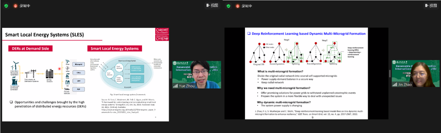 举办本次论坛的目的和意义,并对4位嘉宾表示了热烈欢迎。随后来自新加坡南洋理工大学的徐岩教授作了题为《Coordinated Operation and Planning of Distributed Energy Resources (DERs) in Microgrids》的报告,介绍了其团队在分布式能源规划和运行的相关研究成果;来自俄罗斯斯科尔科沃科学技术研究院的Vladimir Terzija教授作了题为《Situational Awareness and Control of Future Power Systems》的报告,分享了他在英国和俄罗斯的科研团队在电力系统态势感知和控制方面的最新研究成果;来自英国卡迪夫大学的周越博士作了题为《Development of Smart Local Energy Systems in the UK》的报告,介绍了英国智慧能源系统的组成、发展及对中国智慧能源系统建设的启发;来自德国多特蒙德工业大学的赵瑾博士作了题为《Machine Learning Supported Resilient Power Grids》的报告,介绍了其如何将机器学习应用到电力系统韧性评估与提升中。