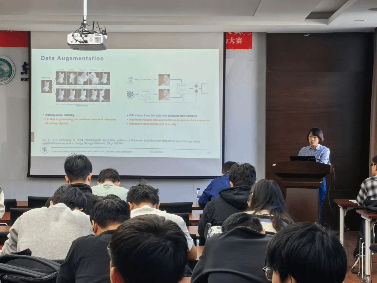 报告会上,隋欣博士围绕基于生成对抗网络的锂离子电池工况数据增强核心主题,深入探讨了生成式人工智能模型在工程领域中的应用潜力。她首先以“AI生成图像与真实图像的可辨识性”互动提问切入,引导与会学生直观感受生成式模型在数据合成方面的能力,并由此引出生成式人工智能的基本框架及其在电池建模中的应用价值;随后,隋老师重点分析数据增强技术在小样本条件下提升模型泛化能力与鲁棒性的作用机制,为工程领域小样本数据场景下的模型优化提供了关键技术思路;最后,通过锂离子电池荷电状态估计作为案例,验证生成对抗网络在合成数据构建中的有效性。