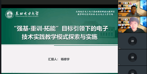 基础教学部主任、校“十四五”青年教师教学标兵杨修宇老师受邀以钉钉线上直播的形式在北部地区电工电子基础课程群虚拟教研室做了《“强基-重训-拓能”目标引领下的电子技术实践教学模式探索与实施》的专题报告。