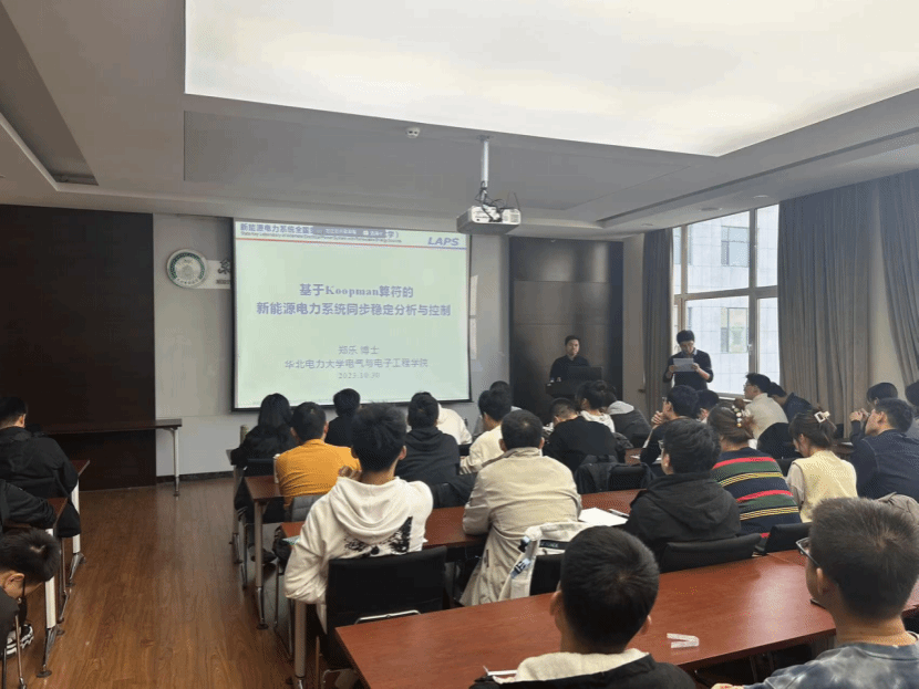 邀请,华北电力大学郑乐博士在电动大楼A412作了题为《基于Koopman算符的新能源电力系统同步稳定分析与控制》的学术报告。本次学术报告由MG电子