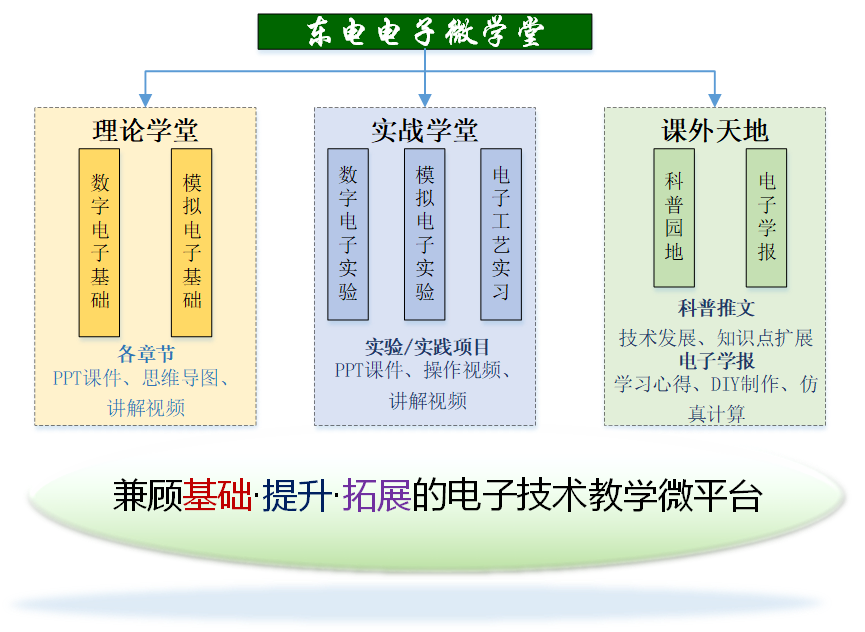 “东电电子微学堂”是涵盖基础提升拓展等多层次教学资源/模块,旨在推进电子技术理论与实践深度融合、提升学生综合能力的电子技术教学服务公众号平台。东电电子微学堂公众号依托省高教学会教研课题“基于微信公众号的微课移动学习平台设计研究”与校教改课题“支持开放实验教学的运营模式设计”。自2016年起历经6年的不断完善、整合、功能扩展,公众号逐步成熟,先后获得校级教学成果一等奖3项,二等奖1项,省级教学成果三等奖1项等多项荣誉。