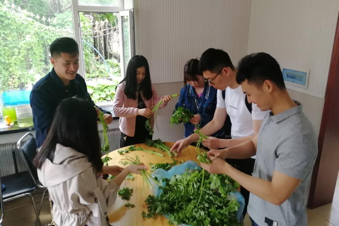 志愿者们在厨房洗菜摘菜