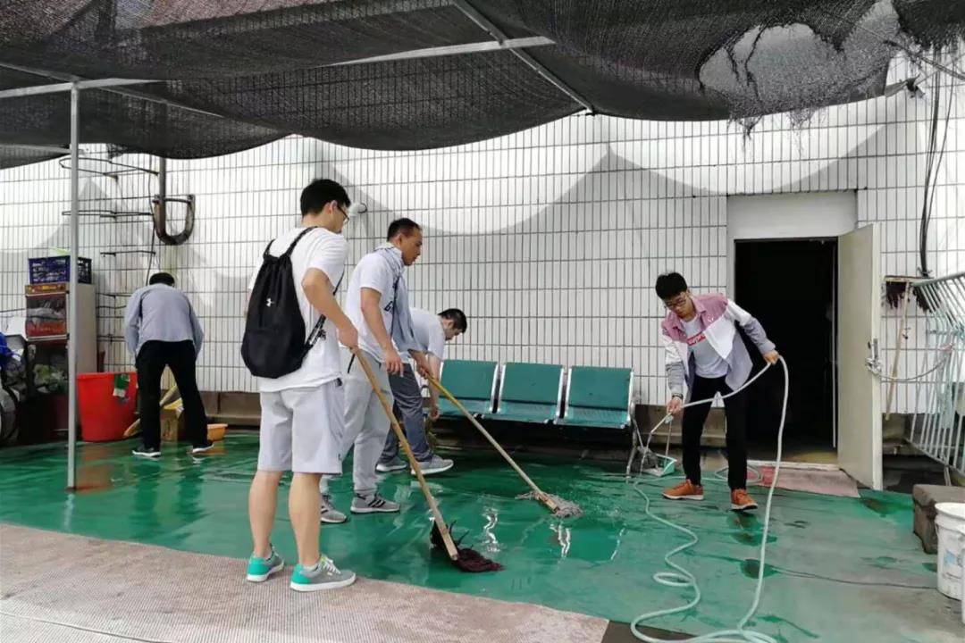 志愿者们认真打扫院内卫生
